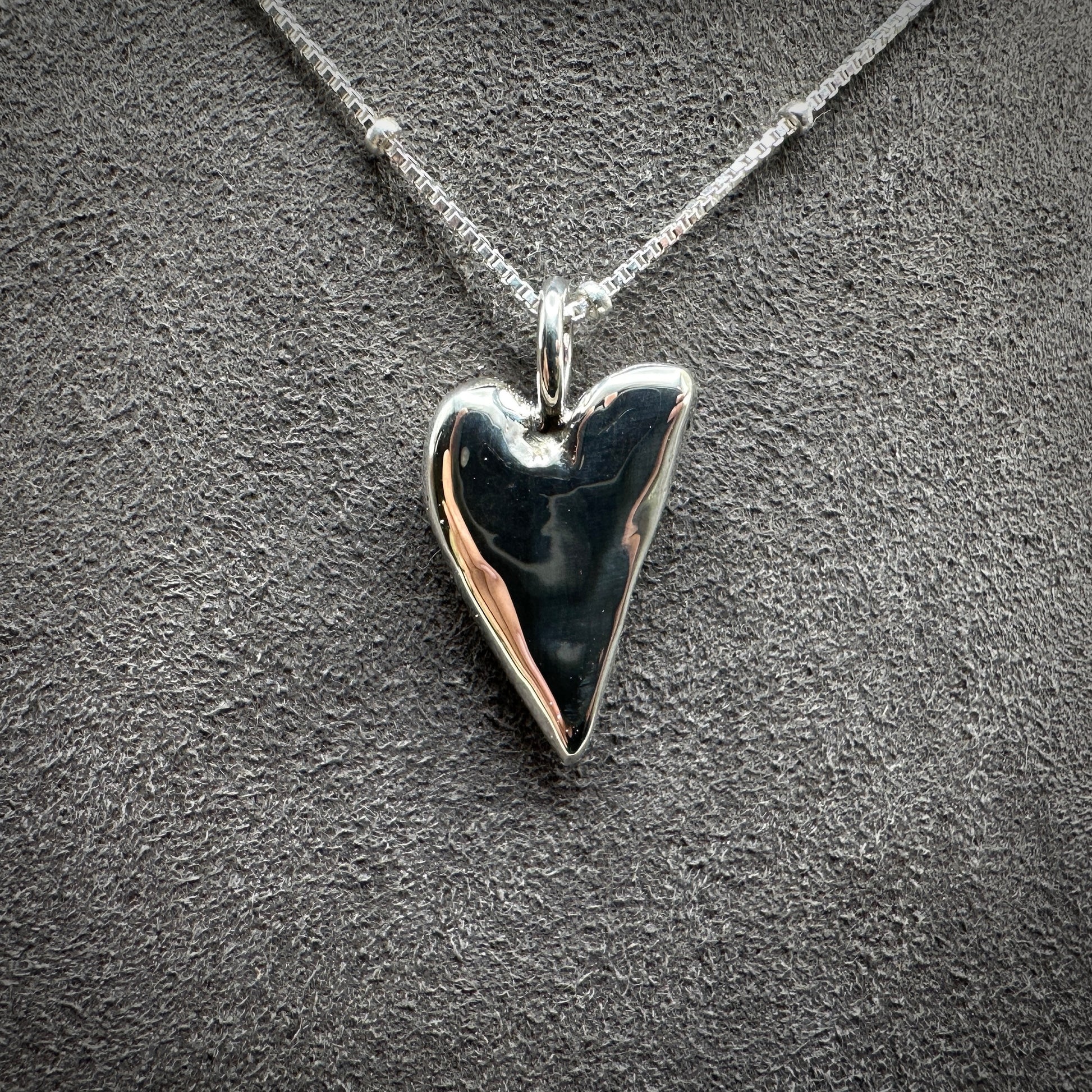 Cast solid Sterling Silver heart on a 18” beaded Venetian chain. Heart is 18mm x 14mm, branded. I individually cast each one of these so will not be exact to the picture is shown but extremely close.