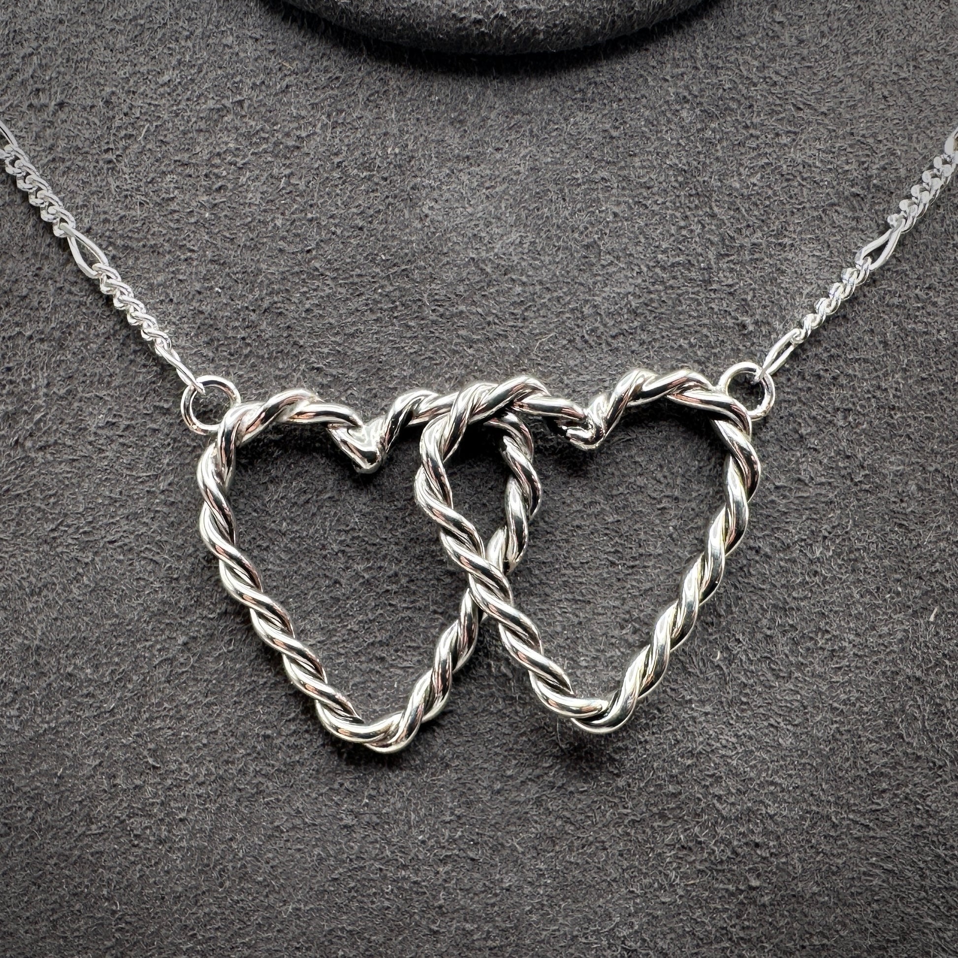 Double Sterling Silver hearts, 23mm x 23mm hearts. 18” 1.8mm diamond cut Figaro chain, branded