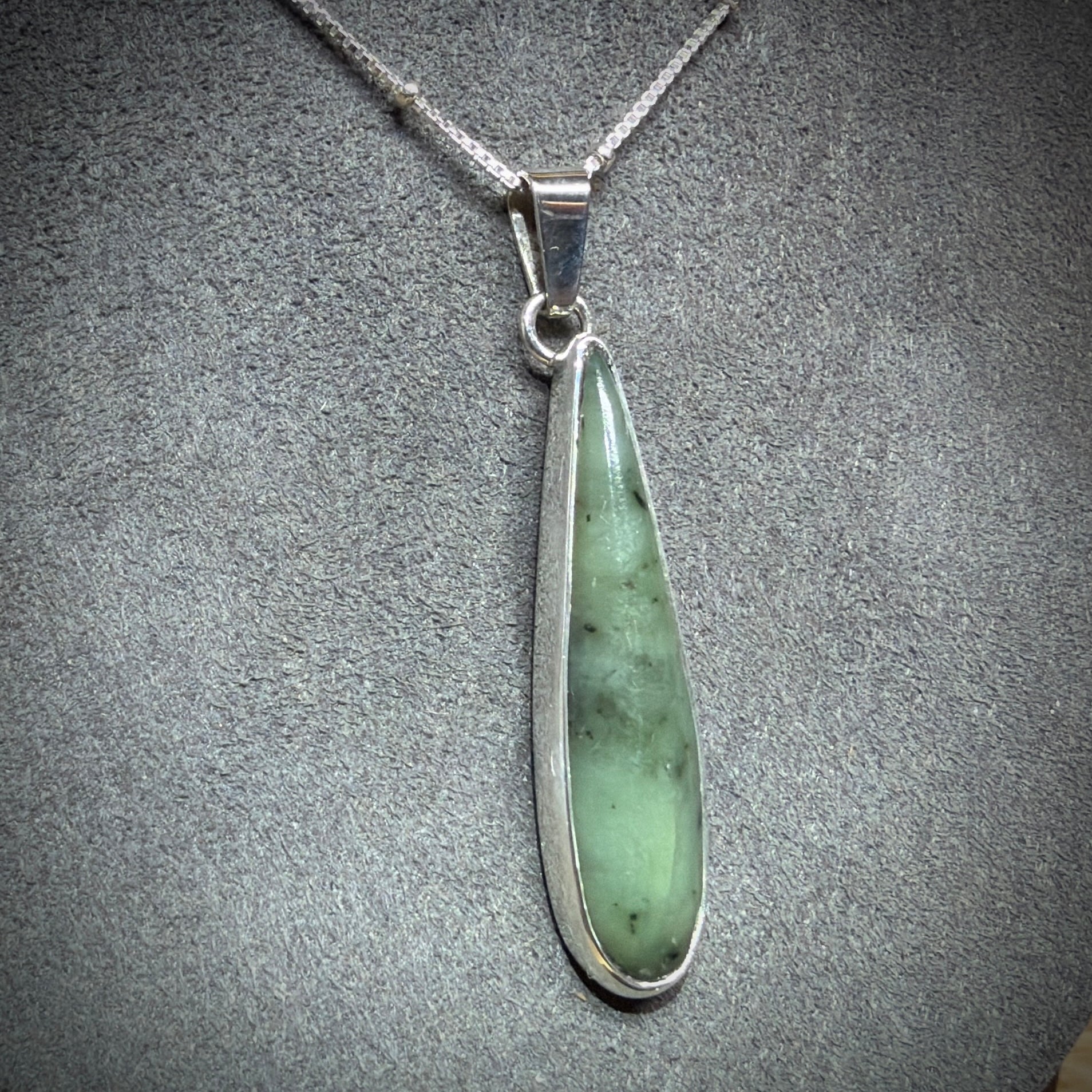 Indonesian Jade pendant swinging on a 18” .85mm Venetian beaded box chain with a lobster clasp. Stone is 35mm x 7mm, branded.