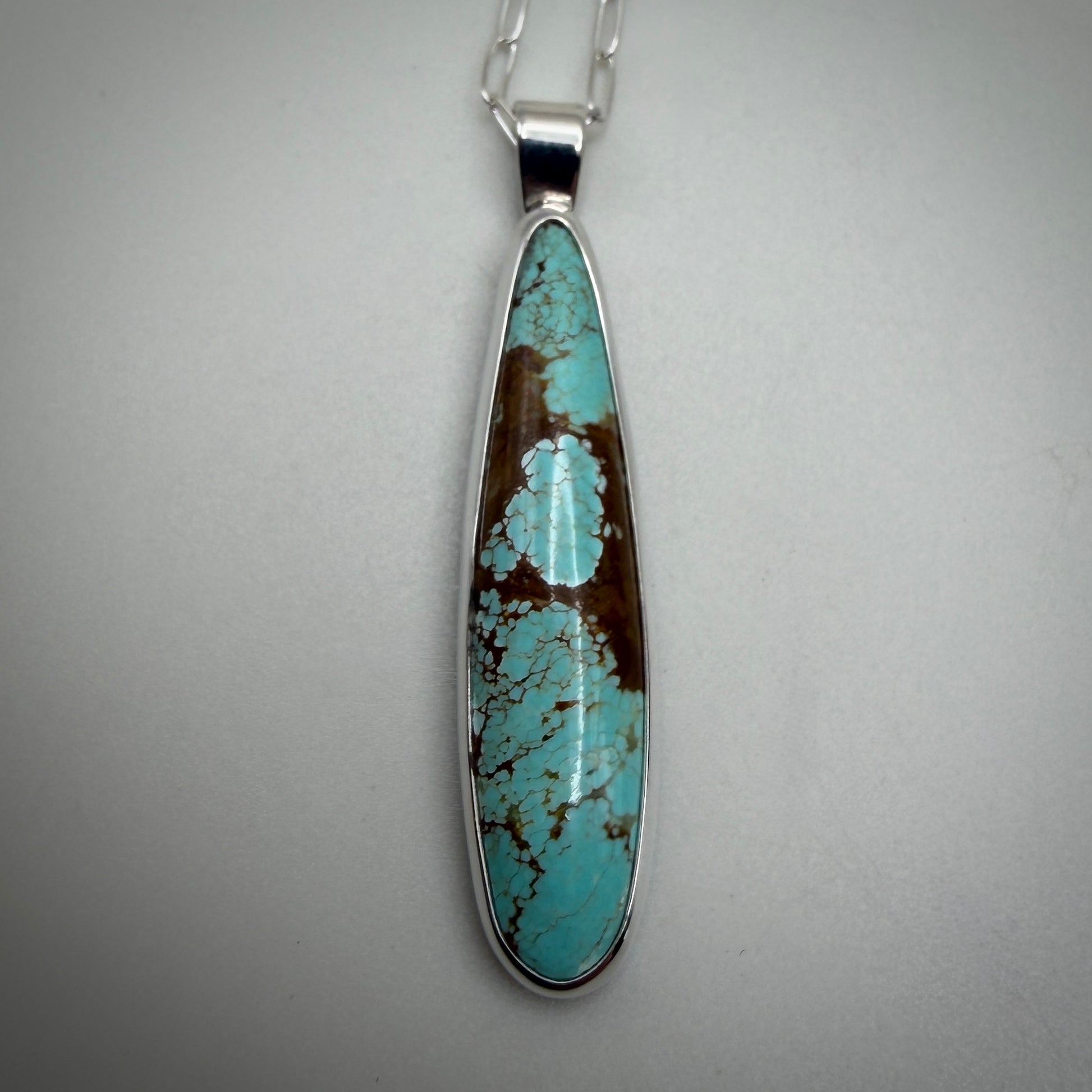 Number 8 mine Turquoise set in Sterling Silver on a 18” 2.1mm cable chain, stone is roughly 38mm x 9mm, branded.