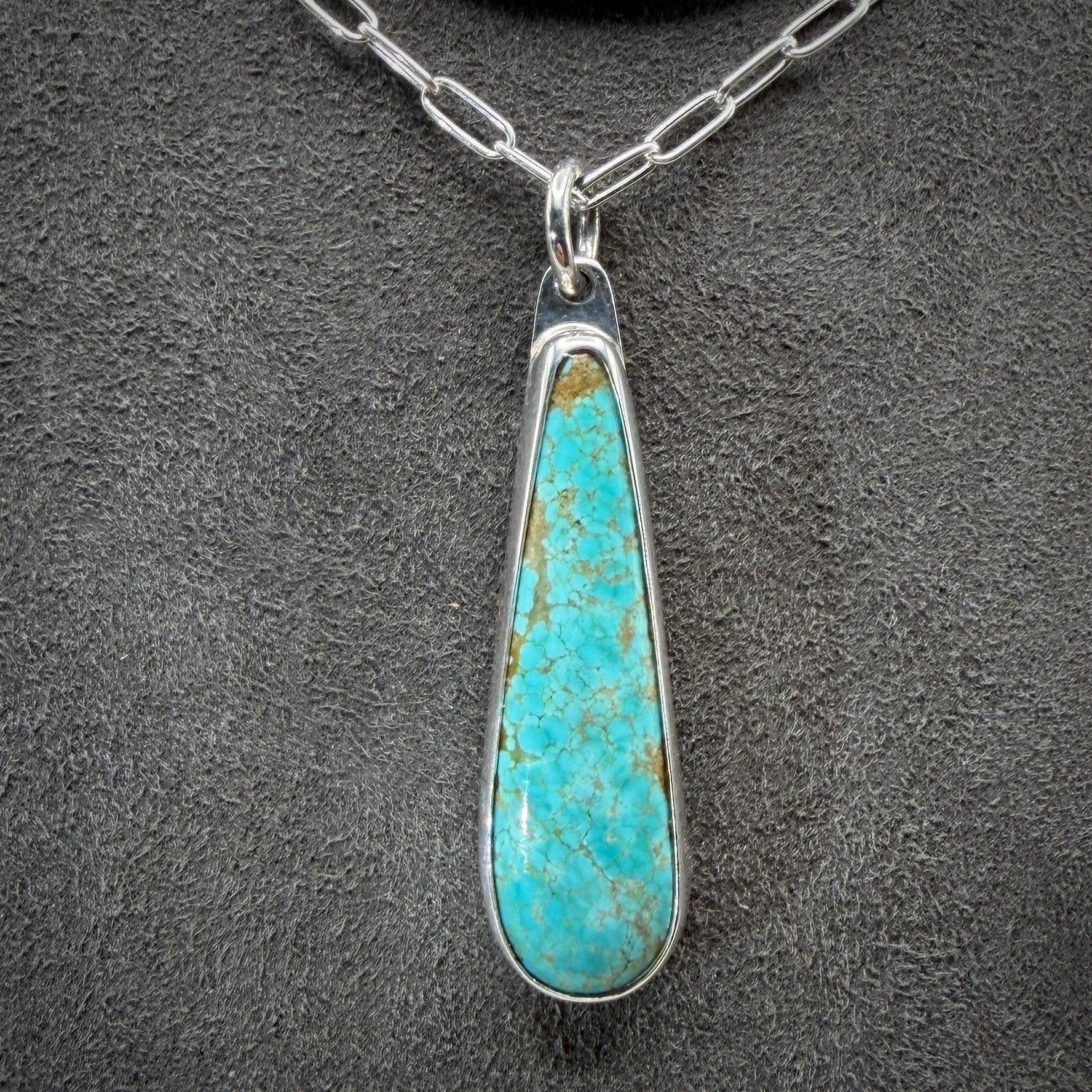 Number 8 mine Turquoise set in Sterling Silver on a 18” 2.6mm cable chain, stone is roughly 32mm x 10mm, branded.